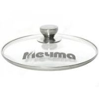 Крышка диаметром 22 см из стекла, с ободком из нержавеющей стали и пластиковой ручкой.